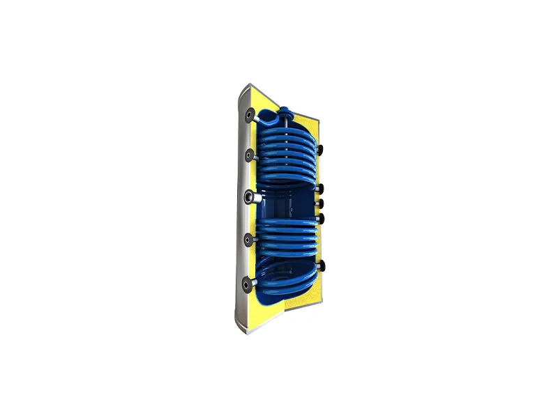 - Εναλλάκτης: Σε περίπτωση δοχείου τριπλής ενέργειας υπάρχει εντός του δοχείου σπειροειδής εναλλάκτης μεταλλικός 1” θηλυκού σπειρώματος. Η σύνδεση του εναλλάκτη με την κεντρική θέρμανση συνίσταται να λειτουργεί με αυτοματισμό, ο οποίος επιτυγχάνεται συνδέοντας το ειδικό αισθητήριο σε θέση που βρίσκεται στο μέσο κατά μήκος του εναλλάκτη. Για σύνδεση με αντλία θερμότητας η είσοδος και έξοδος του μανδύα είναι 1” θηλυκού σπειρώματος
