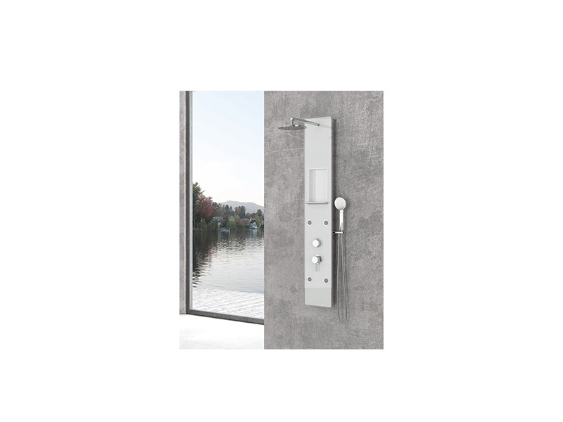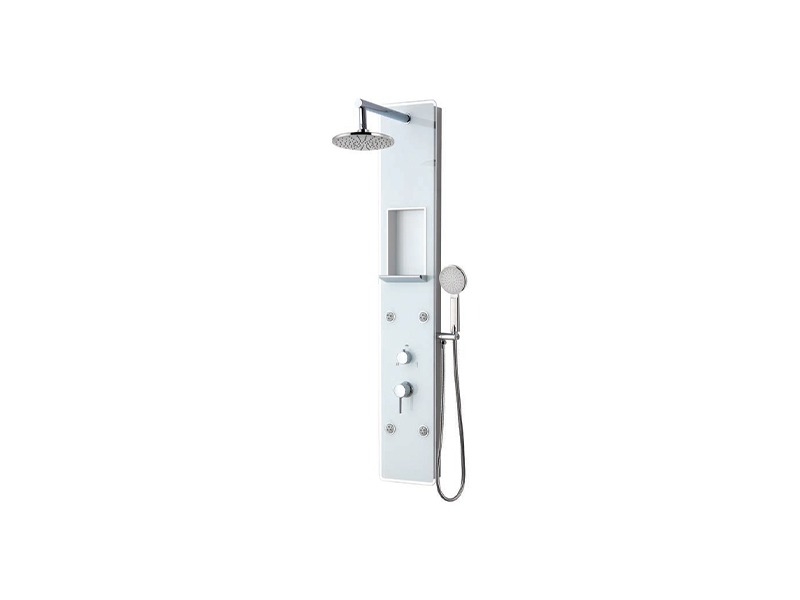 Στήλη υδρομασάζ KARAG Clio G8138 λευκή από PVC και κρύσταλλο ασφαλείας με τηλέφωνο και βάση στήριξης. Διαθέτει τηλέφωνο χειρός με βάση στήριξης και σπιράλ. Ντούζ οροφής και υδρομασάζ με τέσσερις jets νερού.